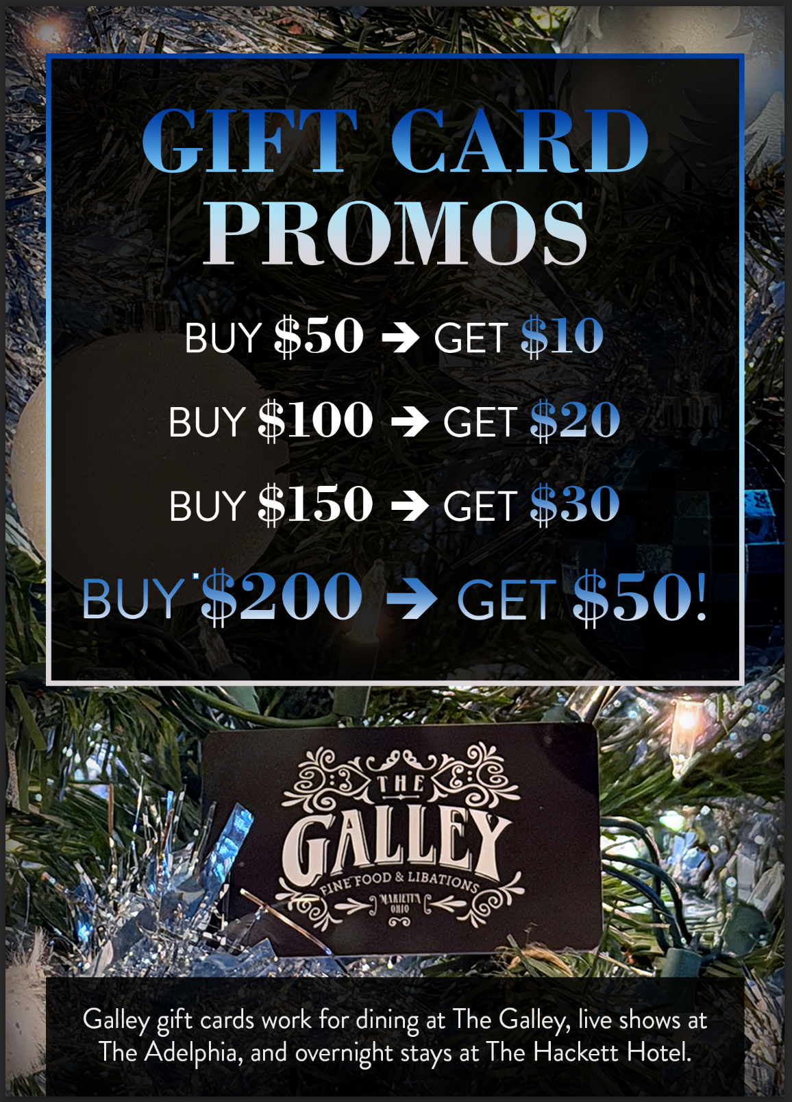 The Galley is quite literally in the center of Historic Marietta and continues to be the hub of its entertainment world. Marietta College students and alumni meet each other for homecoming, graduation, reunions and formals here. Business people hold meetings, client dinners, seminars and banquets with us. Travelers have been delighted with our cuisine and atmosphere.